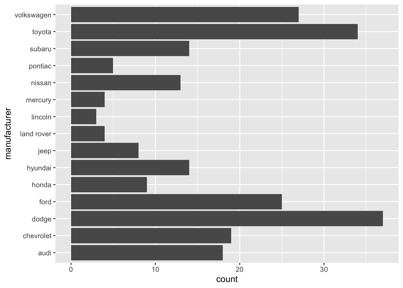 ggplot(data = mpg, aes(x = manufacturer)) +