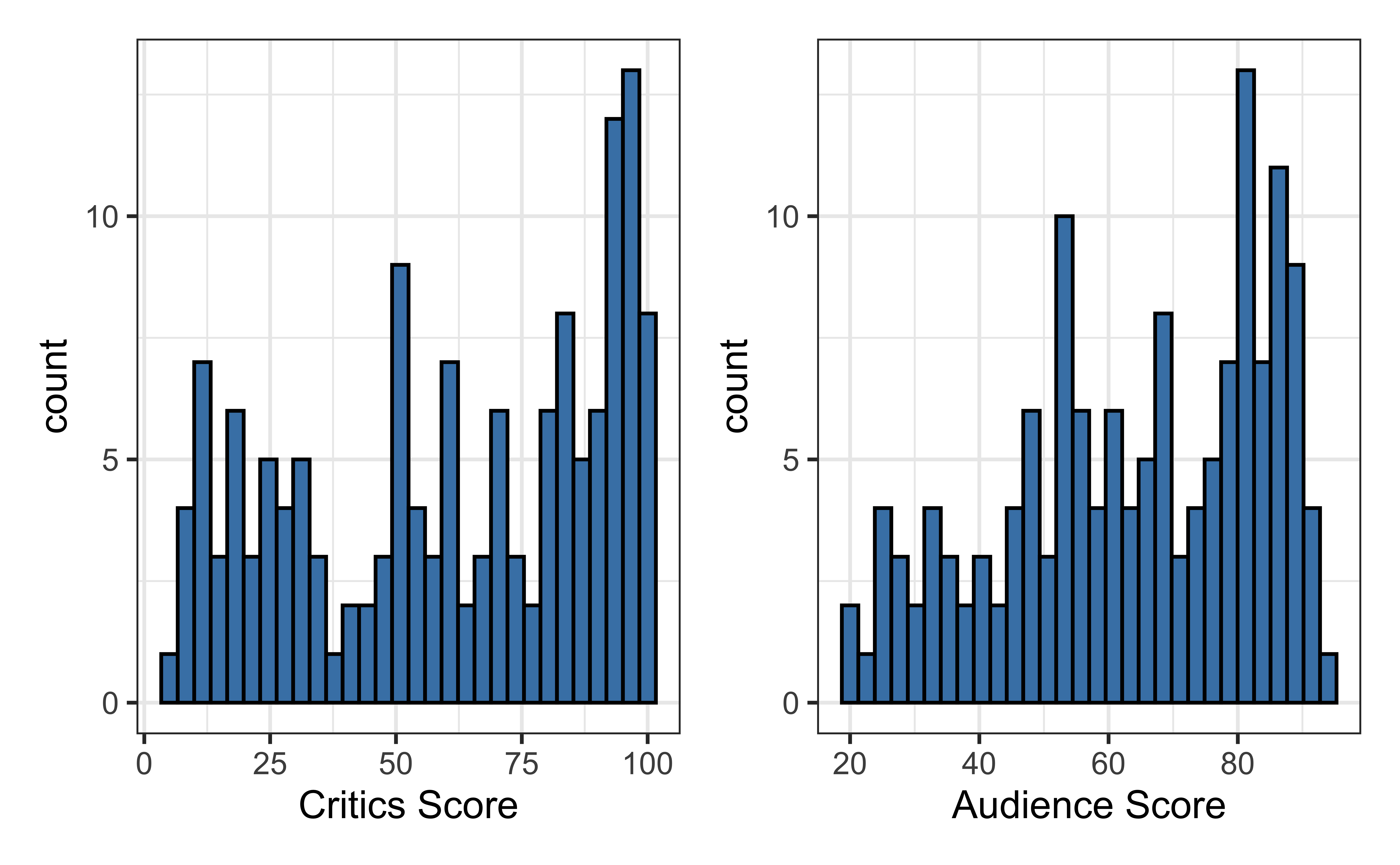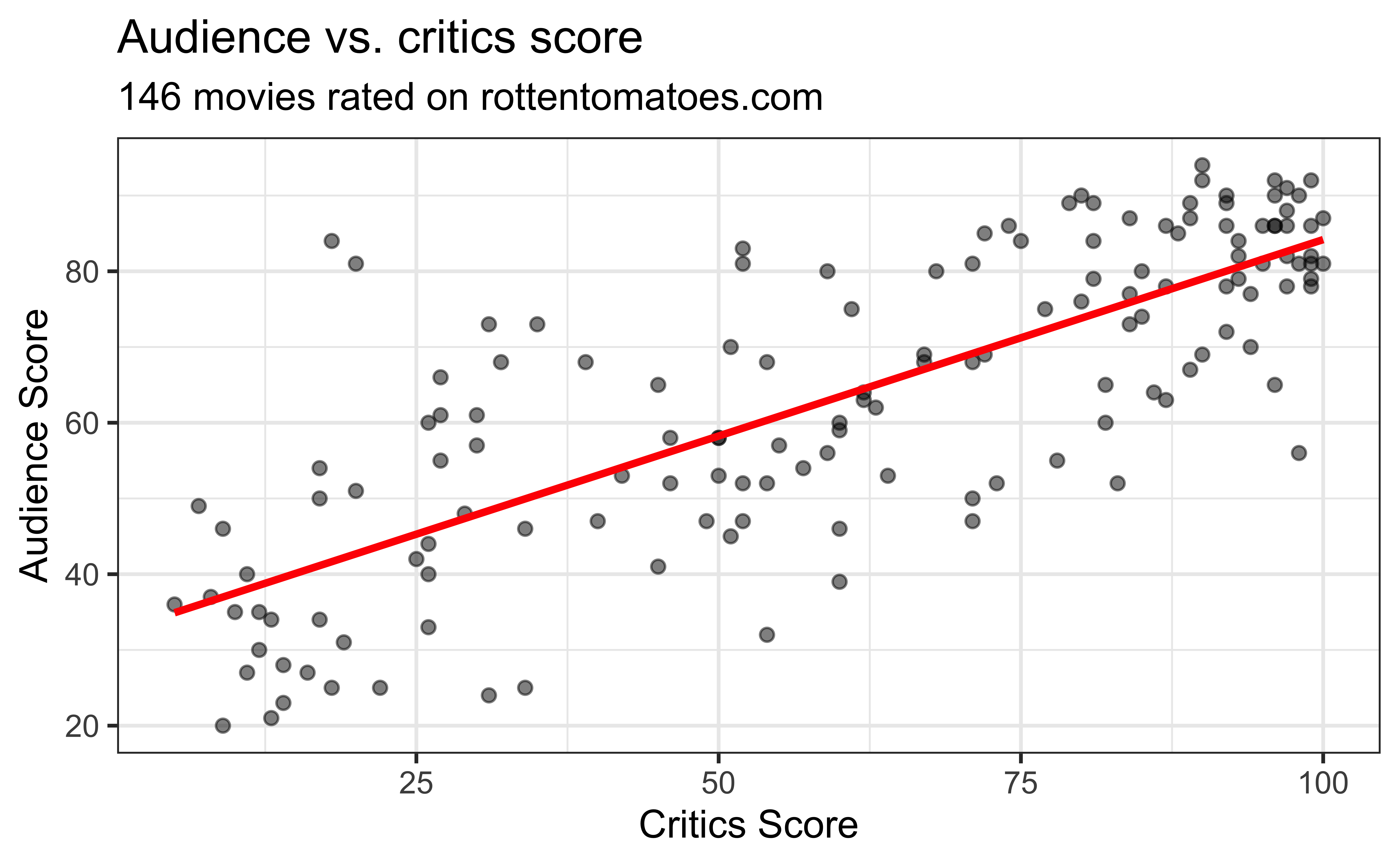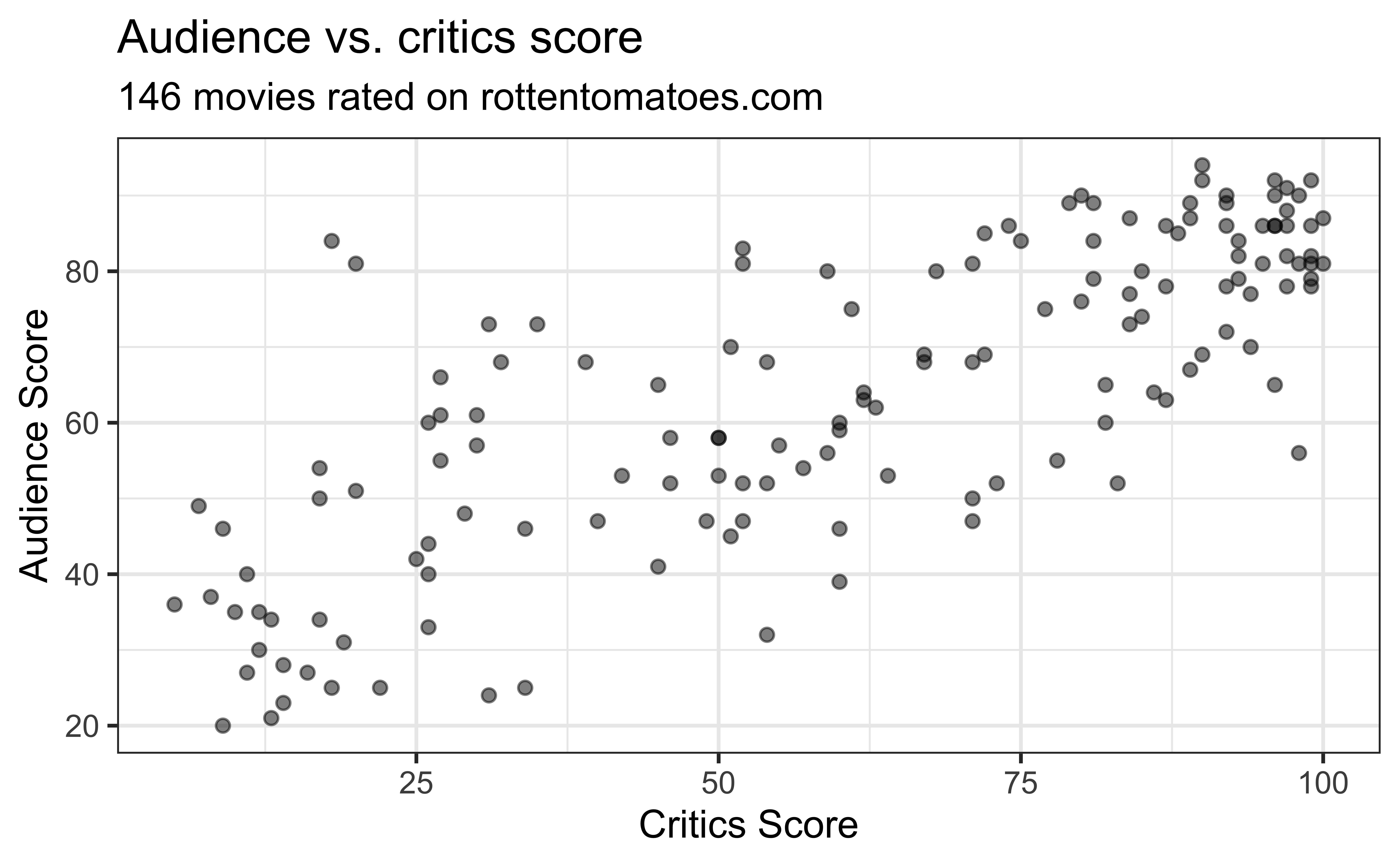 The data set contains the “Tomatometer” score (critics_score) and audience score (audience_score) for 146 movies rated on rottentomatoes.com.
