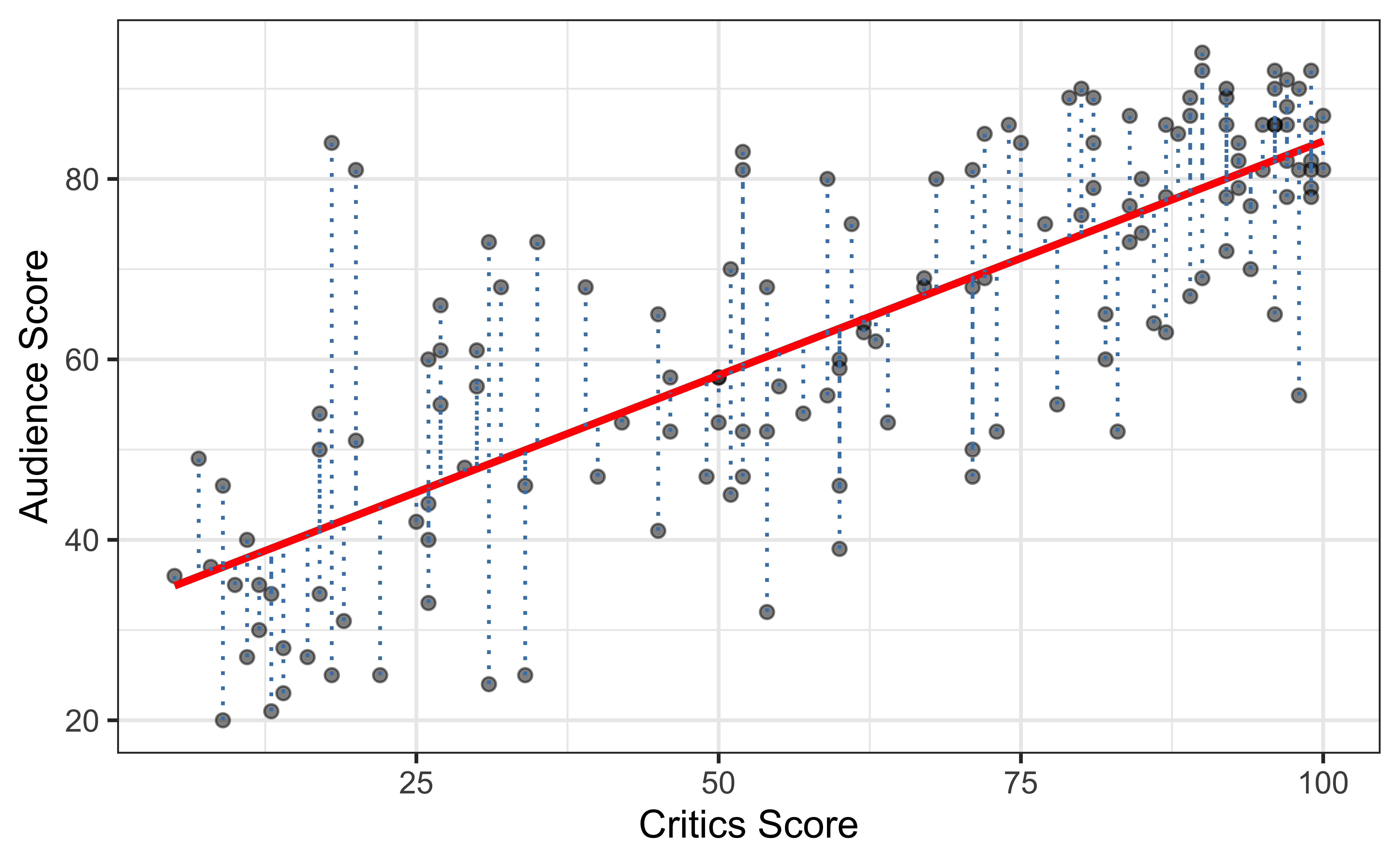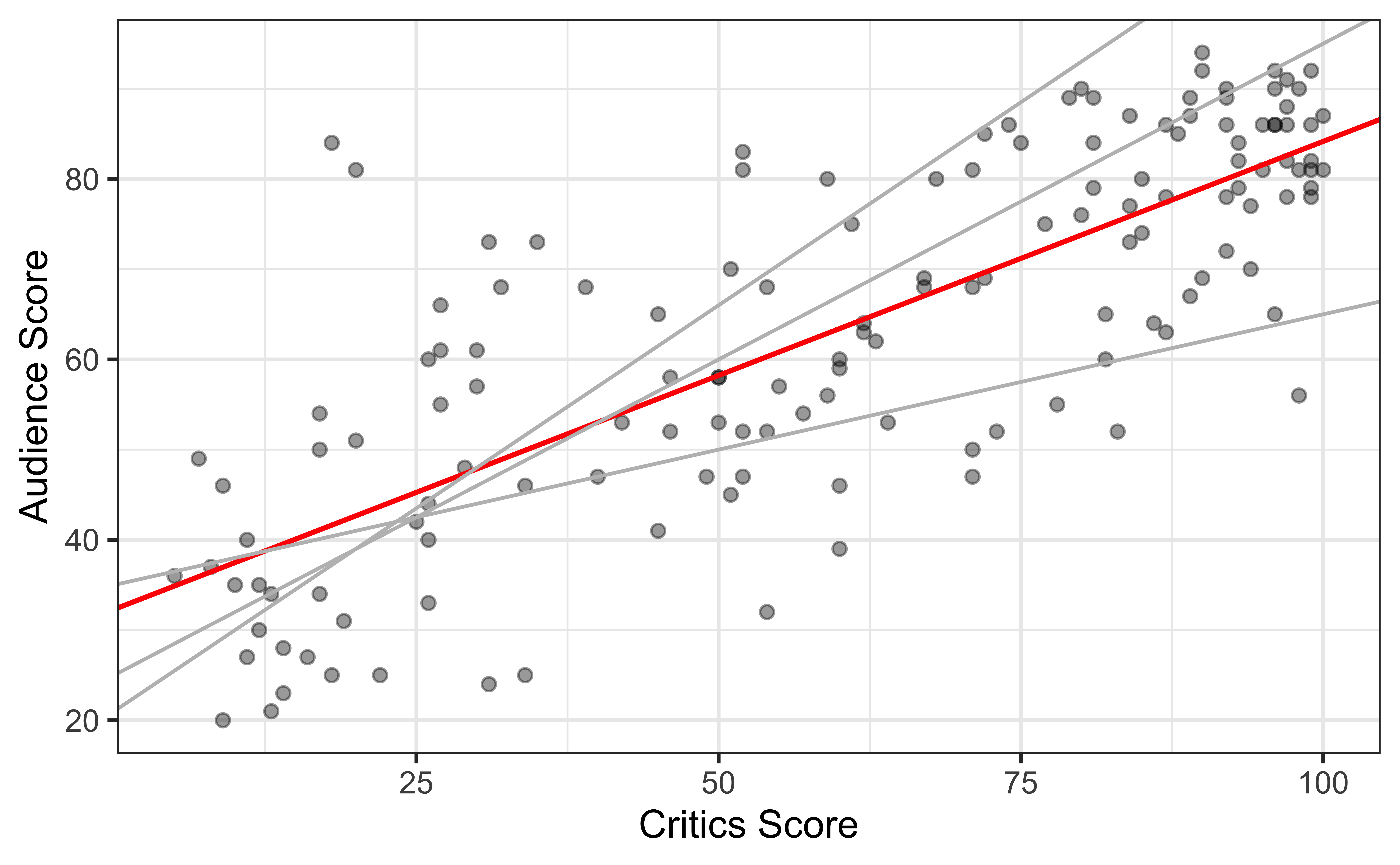 Goal: Fit a line to describe the relationship between the critics score and audience score.