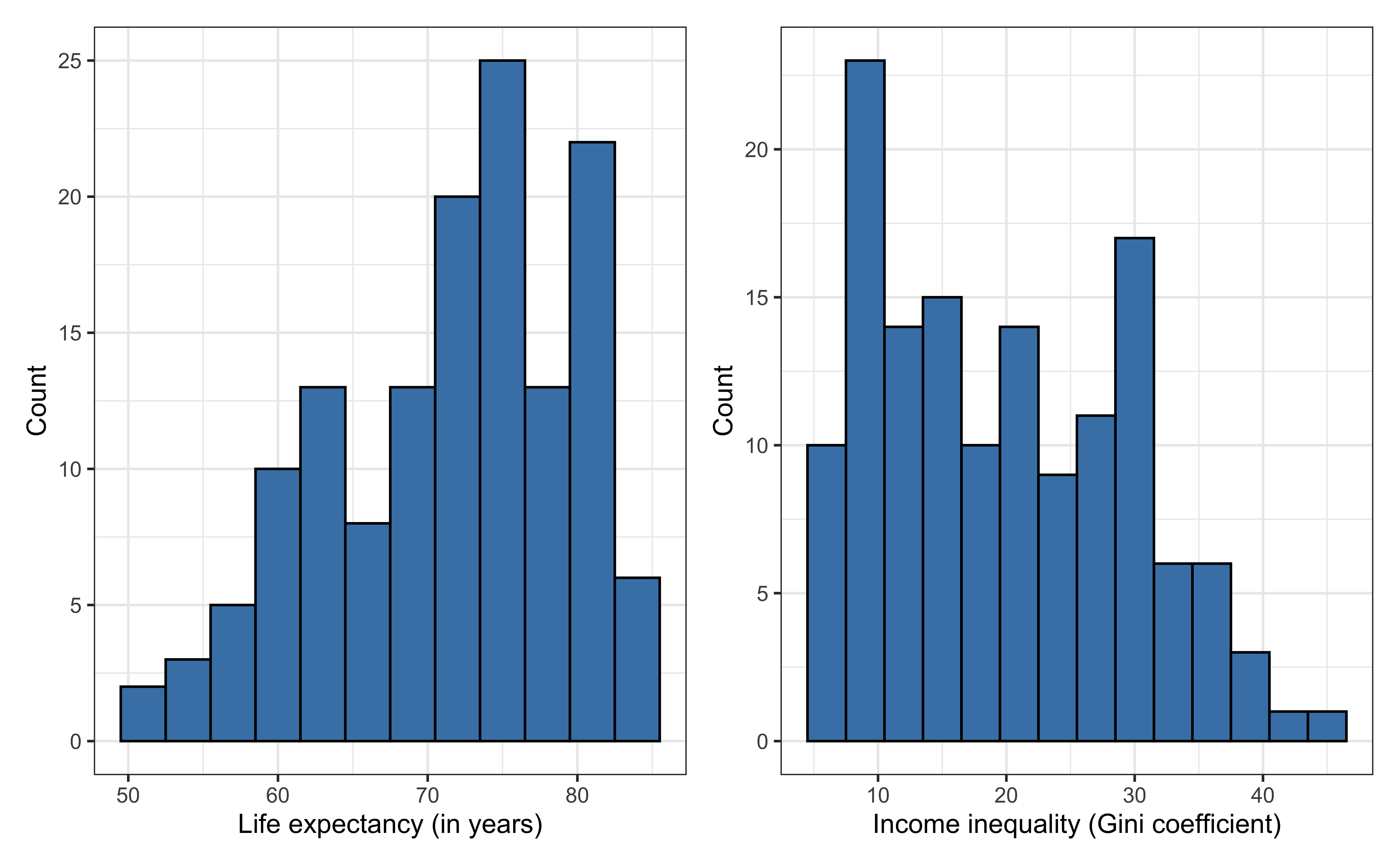 life_exp: The average number of years that a newborn could expect to live, if he or she were to pass through life exposed to the sex- and age-specific death rates prevailing at the time of his or her birth, for a specific year, in a given country, territory, or geographic income_inequality. ( from the World Health Organization)income_inequality: Measure of the deviation of the distribution of income among individuals or households within a country from a perfectly equal distribution. A value of 0 represents absolute equality, a value of 100 absolute inequality (based on Gini coefficient). (from Zarulli et al. (2021))