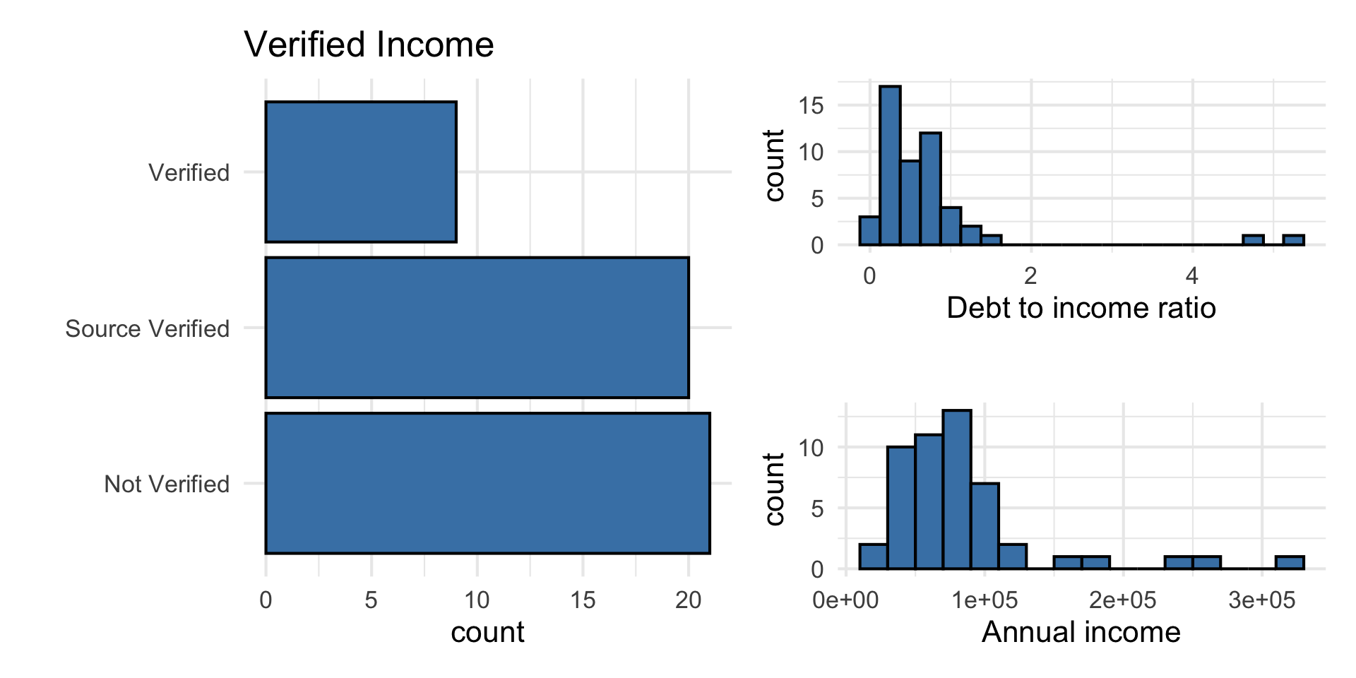 annual_income: Annual incomedebt_to_income: Debt-to-income ratio, i.e. the percentage of a borrower’s total debt divided by their total incomeverified_income: Whether borrower’s income source and amount have been verified (Not Verified,Source Verified,Verified)