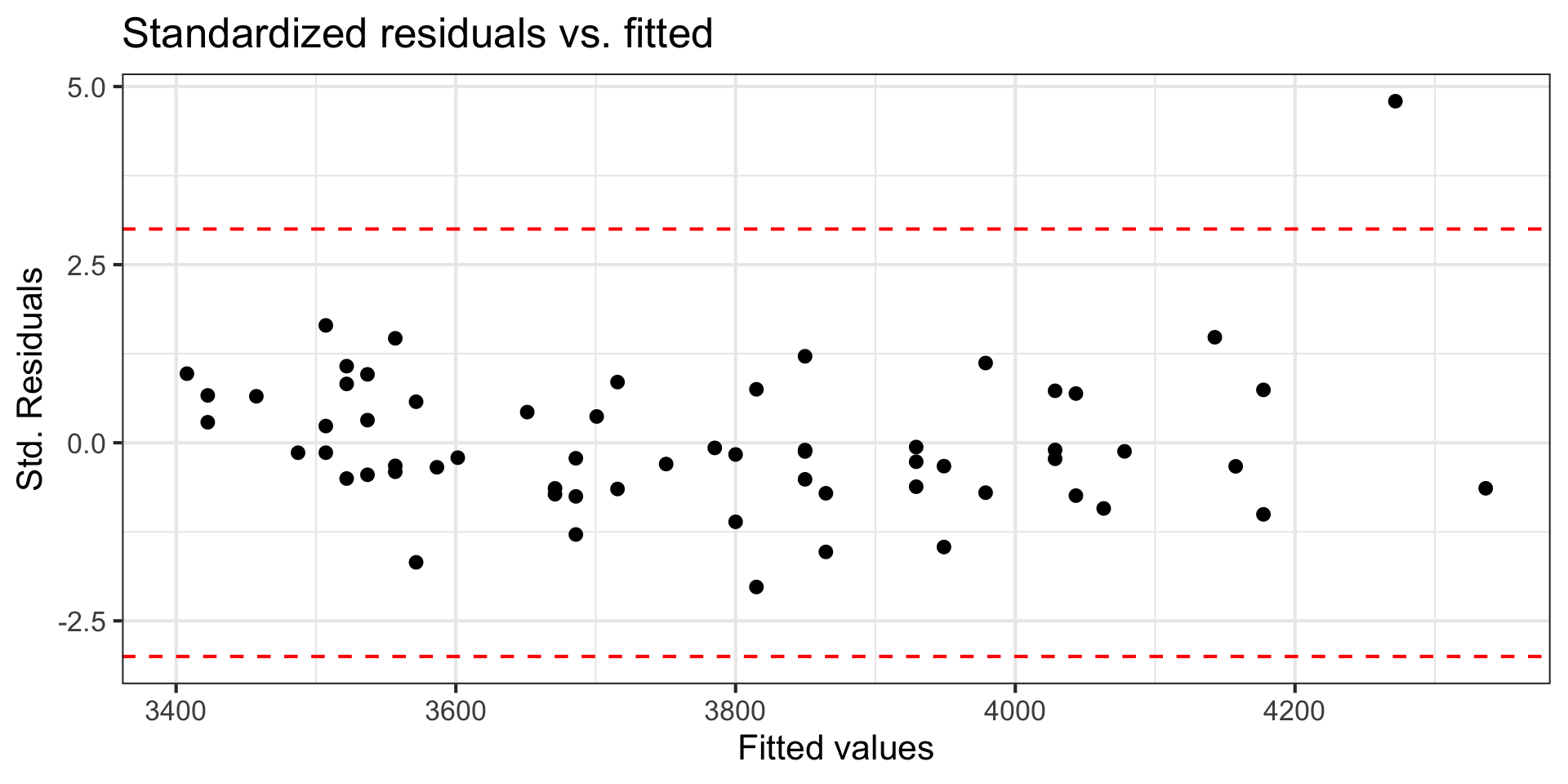 - An observation is a potential outlier if its standardized residual is beyond \(\pm 3\)