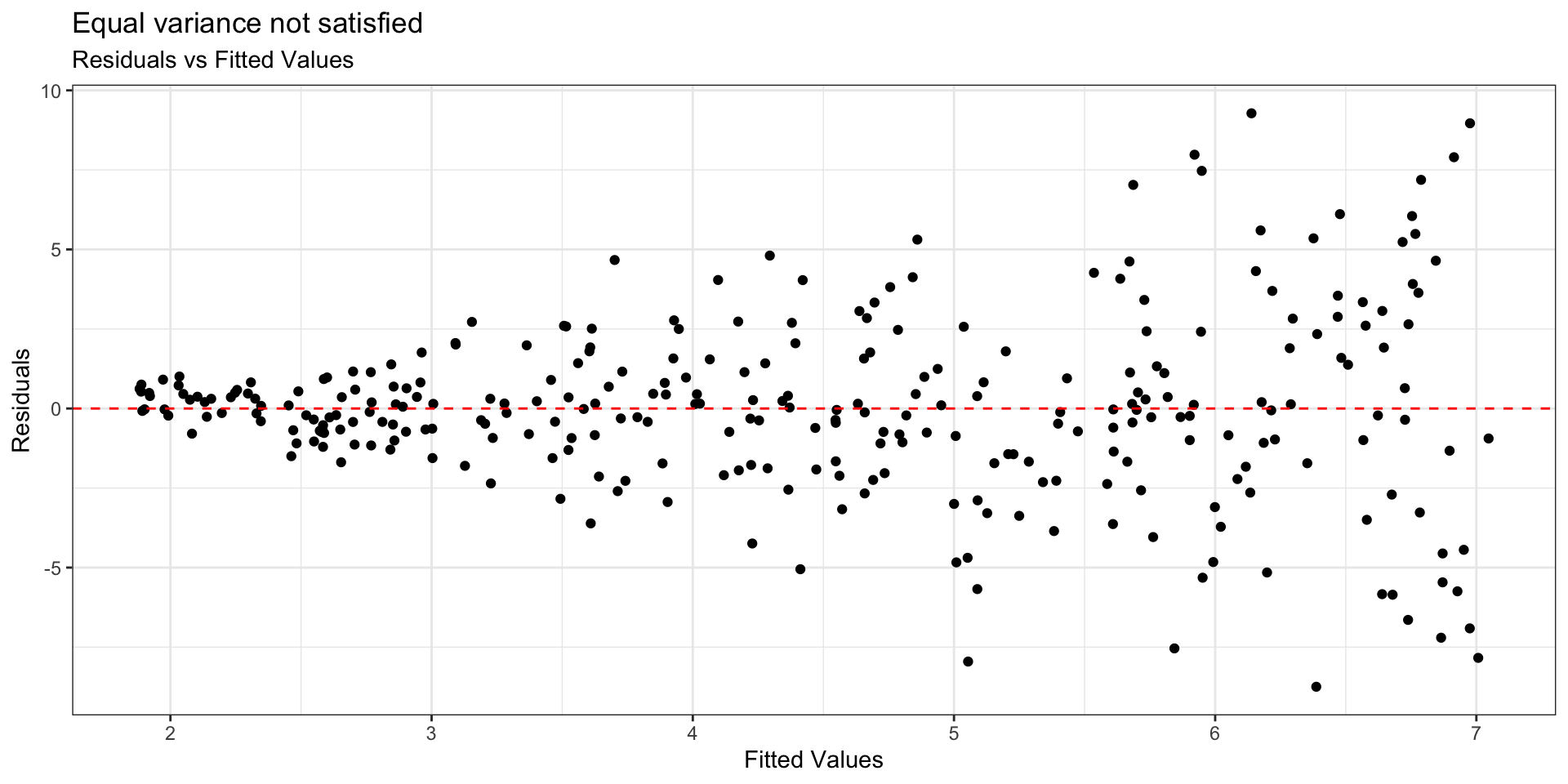 - Equal variance is satisfied if the vertical spread of the points is approximately equal for all fitted values