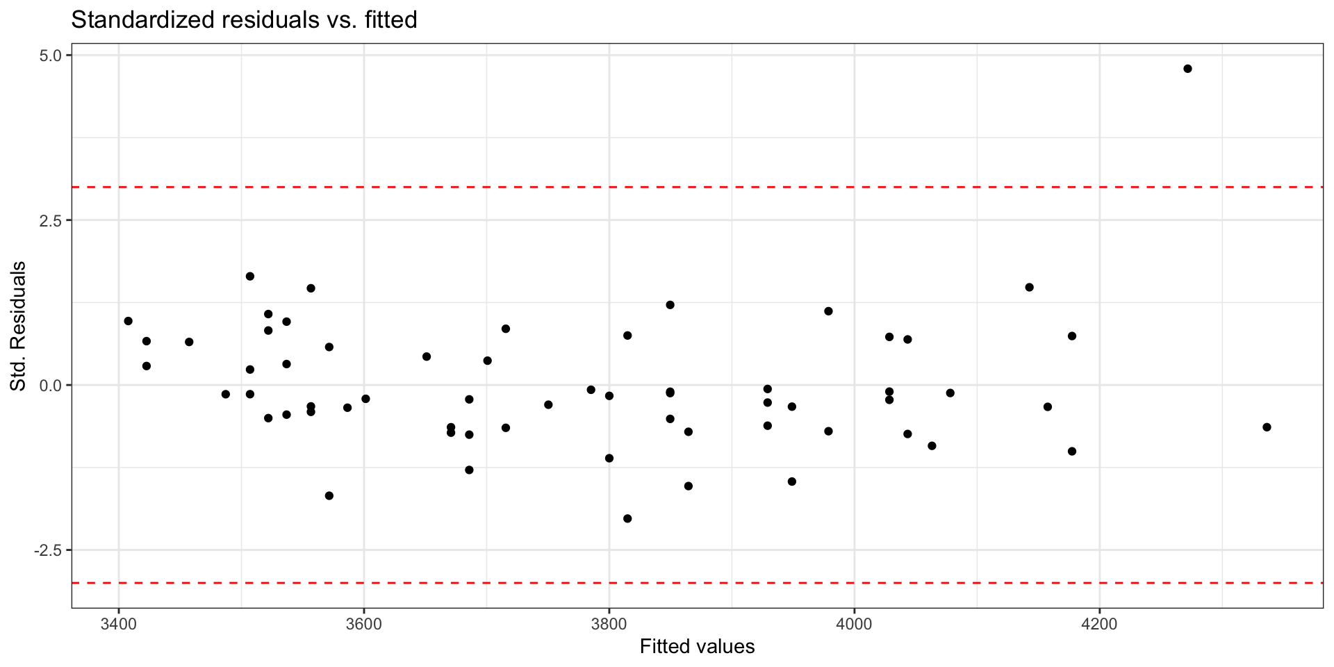 - An observation is a potential outlier if its standardized residual is beyond \(\pm 3\)
