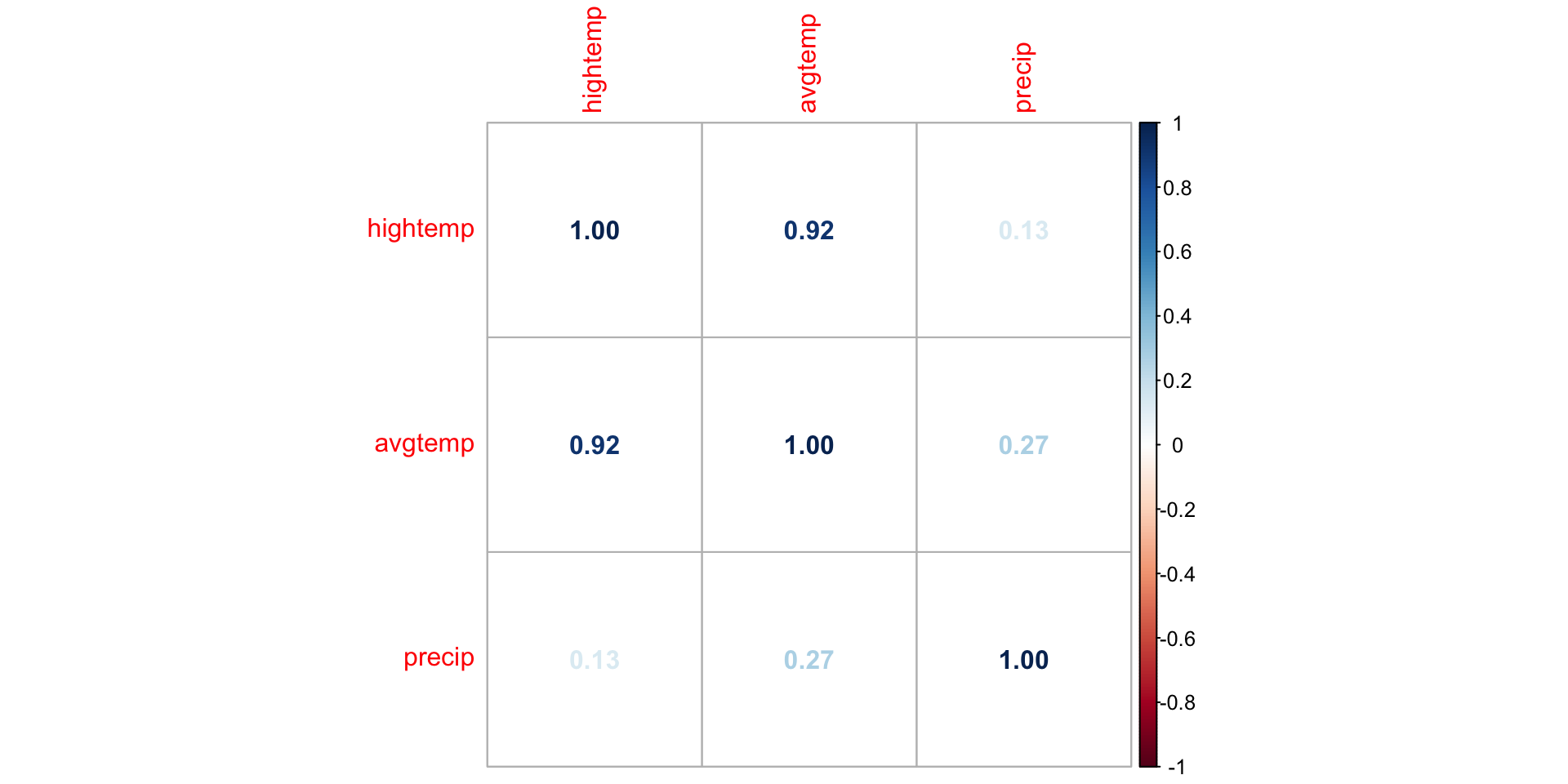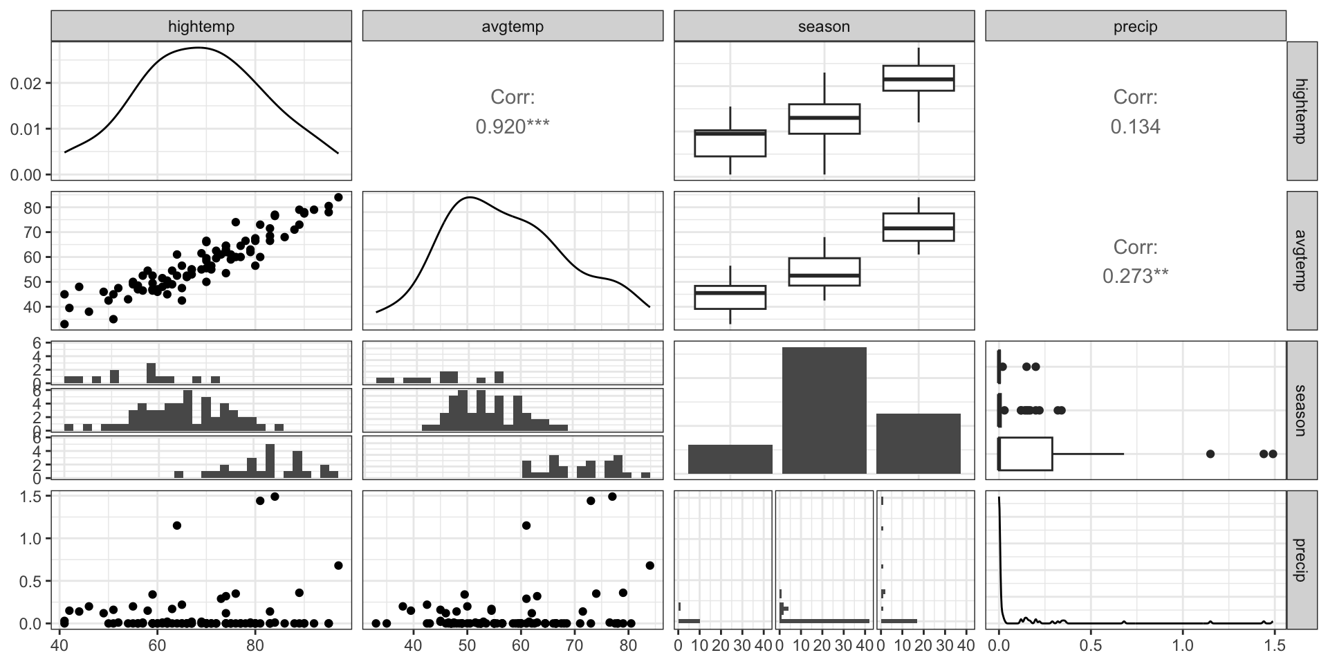 hightempdaily high temperature (in degrees Fahrenheit)avgtempaverage of daily low and daily high temperature (in degrees Fahrenheit)seasonone of “Fall”, “Spring”, or “Summer”precipmeasure of precipitation (in inches)
