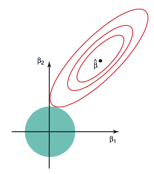 Blue circle is set of possible values of \(\beta_1\) and \(\beta_2\) given the constraint